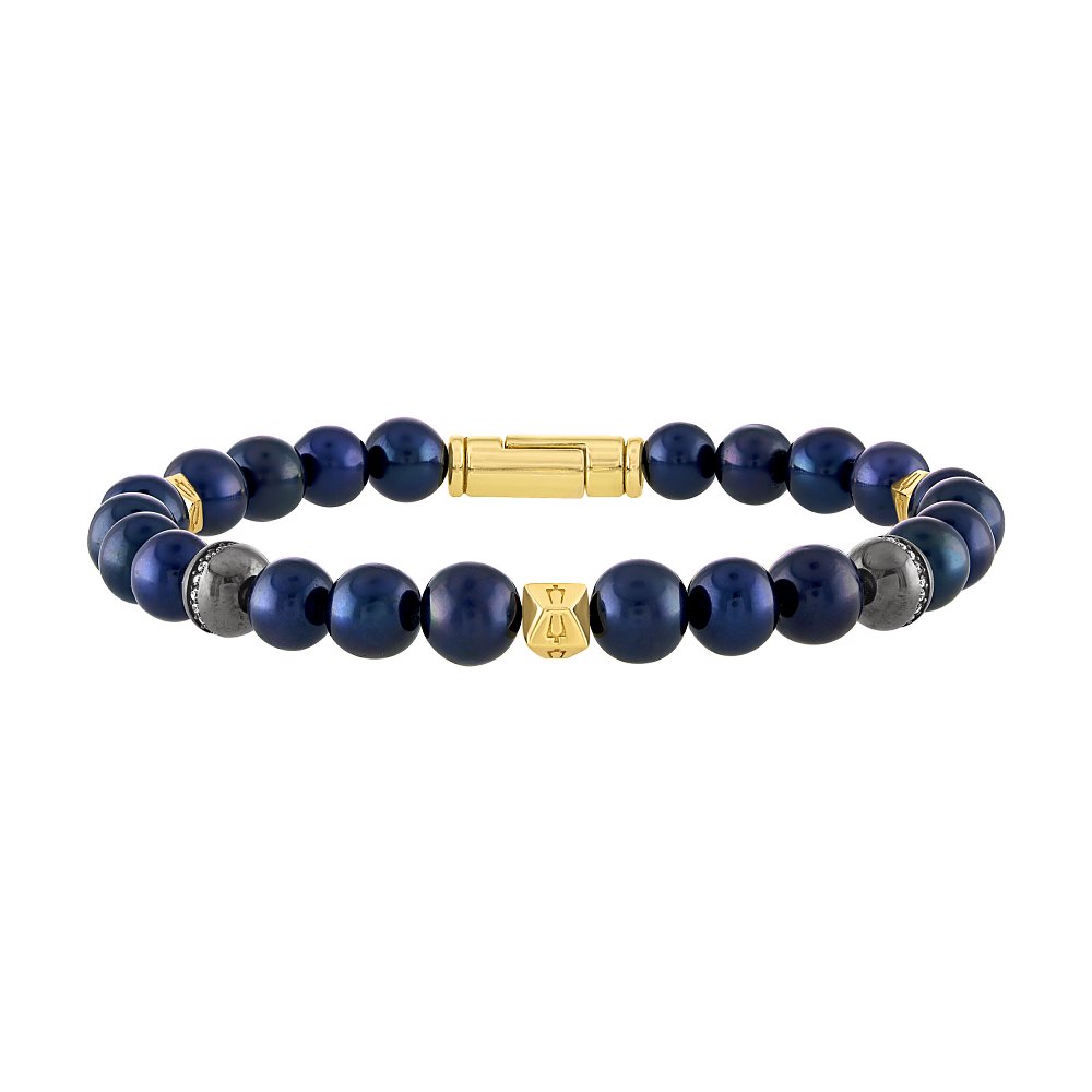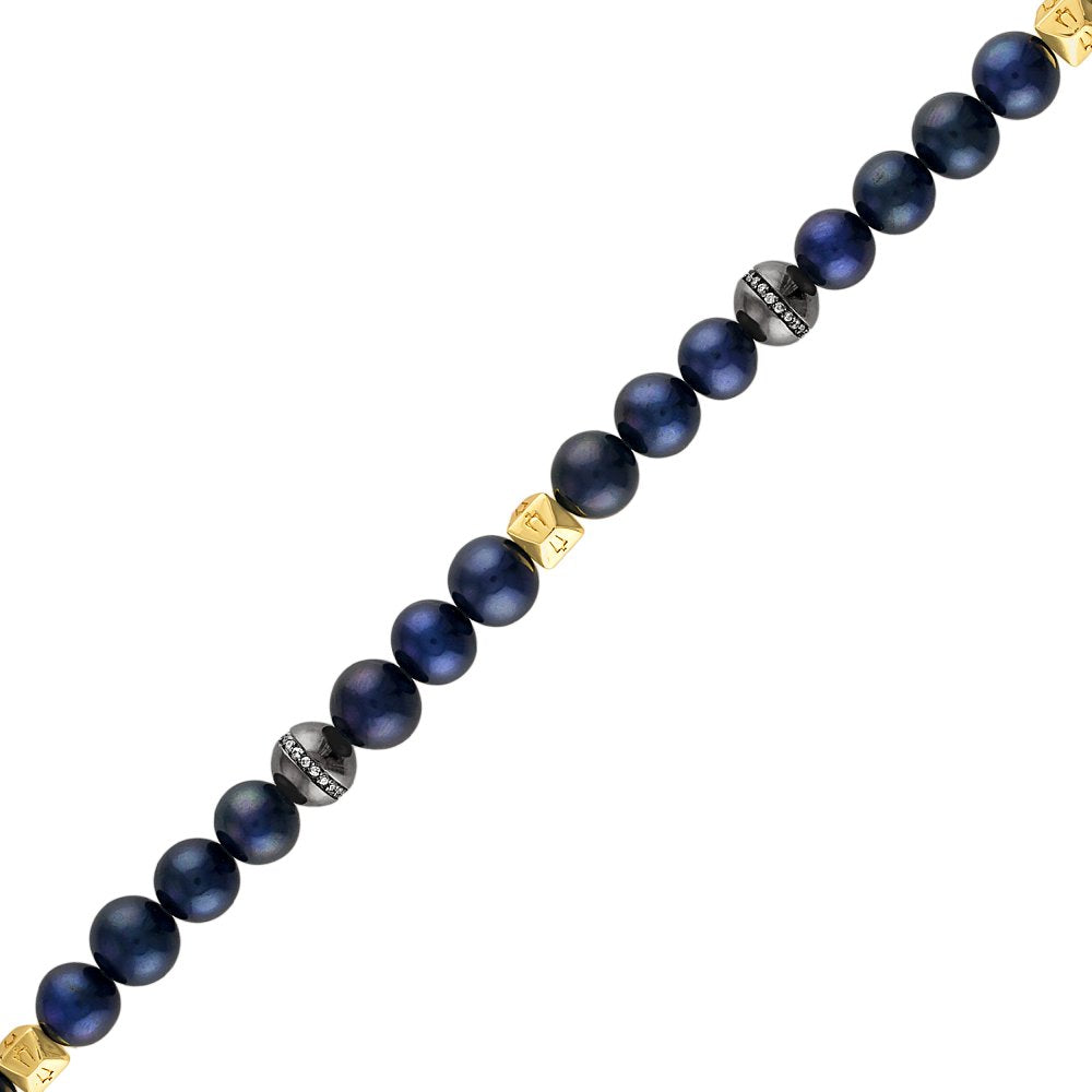 Matte black freshwater pearls in a beaded 8.5"" bracelet accented with 2 black ruthenium-plated sterling silver beads set with white diamonds totaling 0.20 CTTW, and contrasted by 3 gold-tone hexagonal spheres etched with Bulova tuning fork icon on all sides. Magnetic cylinder clasp in 14K gold-plated sterling silver etched with iconic tuning fork logo.