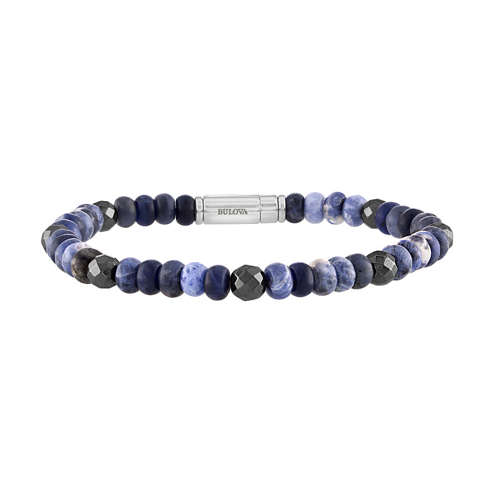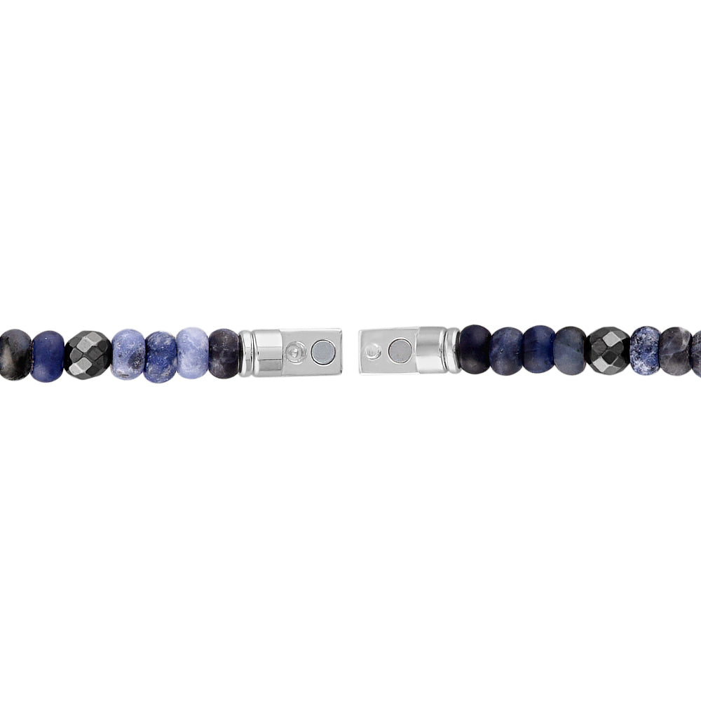 Beaded bracelet 8.5"" in length made of sodalite, also known as the poet's stone, in varying shades of blue, is believed to emanate a soothing and calming energy. Accented throughout with faceted hematite beads (thought to promote stability and optimism) and crafted with a magnetic cylinder clasp in sterling silver. All of our sterling silver is rhodium plated to give the jewelry a brilliant shine and provide enhanced durability.