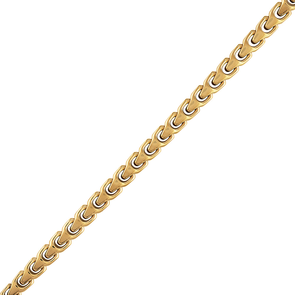 Destined to become a classic, the exclusive Bulova Link™ Collection proudly features our historic tuning fork as its signature design element. This striking 8MM bracelet in gold-tone stainless steel offers a bold yet timeless look. Features a box lock clasp etched with Bulova's iconic logo. Measures 7.5"" in length.