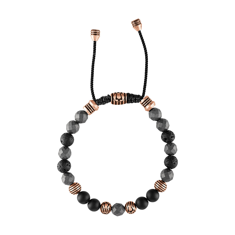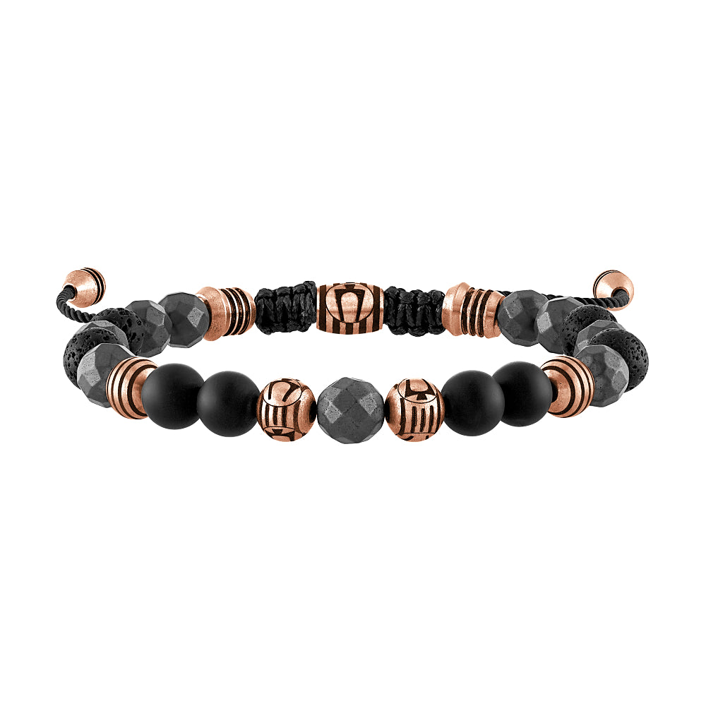 An adjustable beaded bolo bracelet with a more rugged look features semi-precious matte black onyx, a stone of protection and stamina. Interspersed with faceted matte hematite spheres, thought to promote stability and optimism, and also with black lava beads, reputed to impart calmness and strength. Accented with striped rose-tone stainless steel beads featuring the Bulova tuning fork logo. Black cord adjusts easily for a comfortable fit and is capped with two steel beads etched with the Latin GRAMMY® logo. 8MM beads.