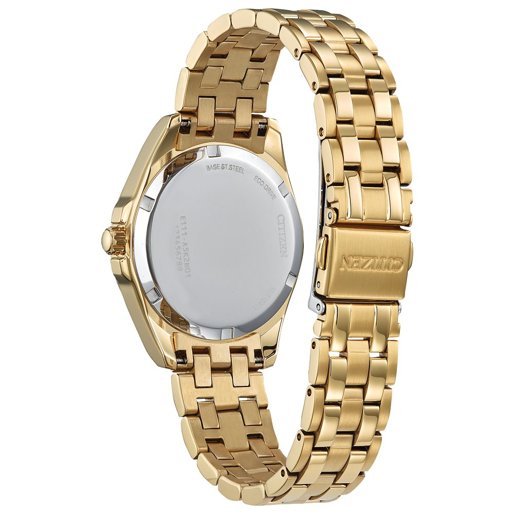A refined take to a classic style. Featuring a gold-tone stainless steel case with a champagne 3-hand dial and date function, the newest addition to the Classic collection is understated and stylish. This Classic watch includes a gold-tone stainless steel bracelet with a fold-over clasp and is Sustainably powered by light with Eco-Drive technology, this watch never needs a battery and offers a sleek look and upscale feel.