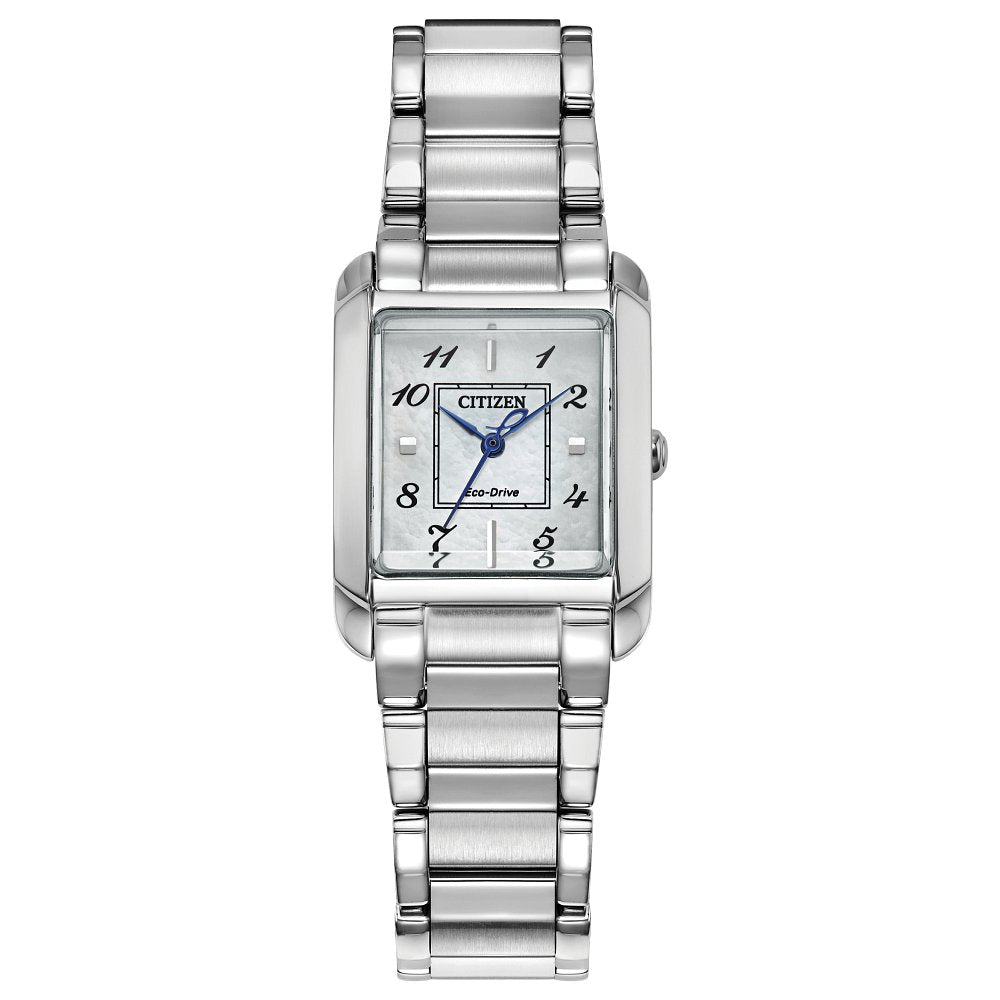 Classic lines and subtle sophistication make this latest piece to our womens collection, the Citizen L Bianca, a charming addition of sustainable luxury. With?a design inspired and celebrating feminine motifs in art deco, the distinctive stainless-steel timepiece is a captivating accent on the wrist that's perfect for everyday wear. A curved rectangular shape defines the watch's 22mm silhouette, with a subtle crown and stainless-steel bracelet rounding out the look. On its mother-of-pearl dial, alternating applied and printed markers work with a pair of blue-touched hands for a highly aesthetic style, with its printed inner square once again pointing to chic inspirations. Sustainably powered by any light with our proprietary Eco-Drive technology that never needs a battery, this elegant ladies watch is the perfect addition to any outfit. Water resistant to 50 meters. Caliber B035.