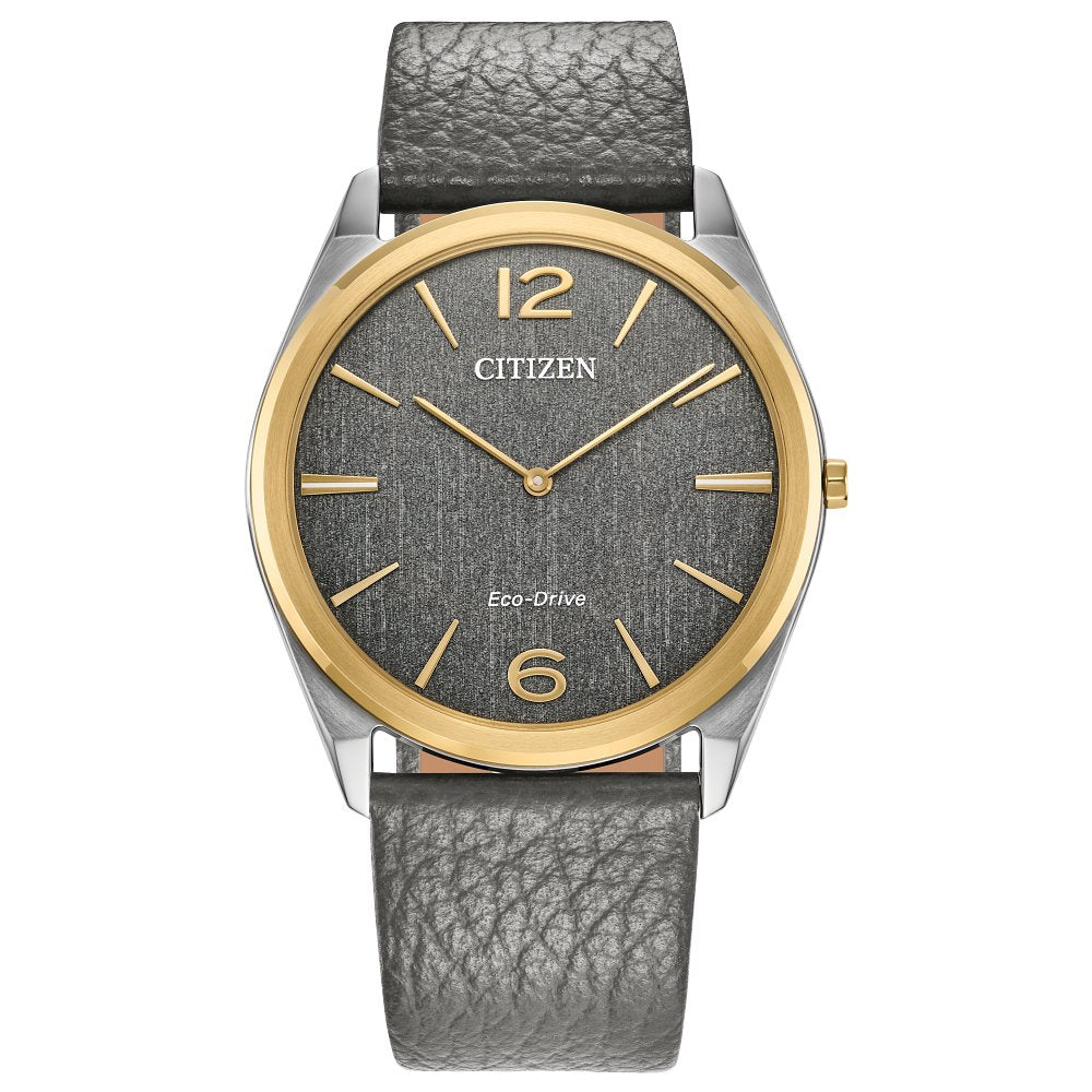 Classic lines and a simple silhouette define the newest addition to the Classic collection. This all-purpose dress watch features a versatile two-tone silver- and gold-tone stainless steel 38.4mm case, a two-hand gray dial featuring an entrancing metallic powder aesthetic with gold-tone hands and markers, and is secured to the wrist via a grained gray leather strap with buckle closure. Sustainably powered by any light with Eco-Drive technology and never needs a battery. Water resistant to 50 meters. Caliber G872.