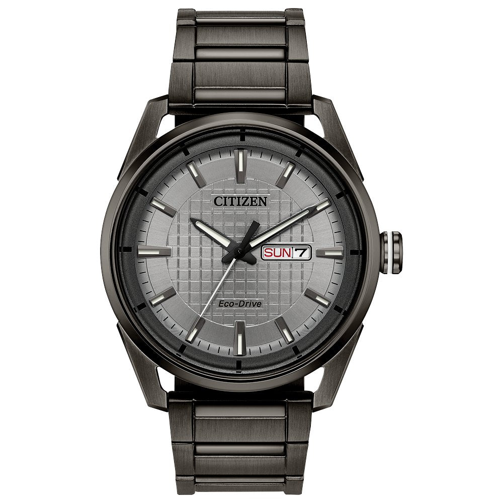 The Drive from CITIZEN CTO collection. A collection of watches with classically modern design. Featured here in a gray ion plated stainless steel with gray dial and day/date. Featuring our Eco-Drive technology – powered by light, any light. Never needs a battery. Caliber number J800.