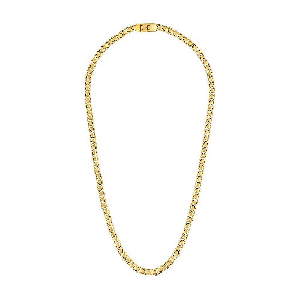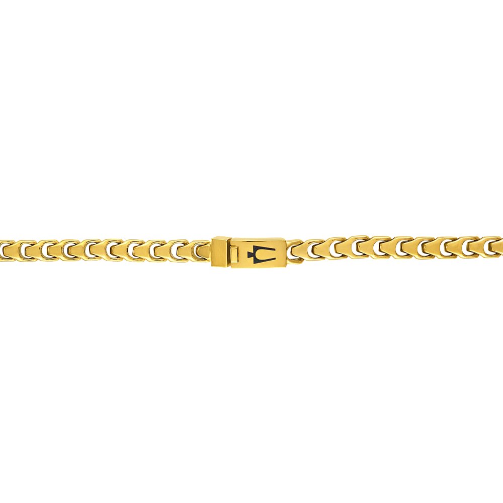 The fresh new Bulova Signature Link Collection abounds in both personality and presence. Capturing the essence of our historic tuning fork symbol, this 6MM gold-tone stainless steel chain measures 22"" in length and features a clasp closure etched with our iconic logo.