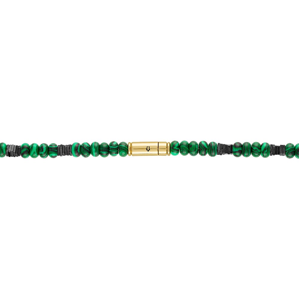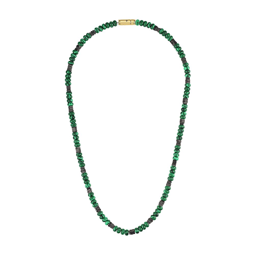 Beaded necklace 22"" in length made of malachite, a stone of transformation, in the deep green colors of nature, believed to open the heart to unconditional love. Alternating sections of stacked flat hematite squares and crafted with a magnetic cylinder clasp in 14K gold-plated sterling silver.